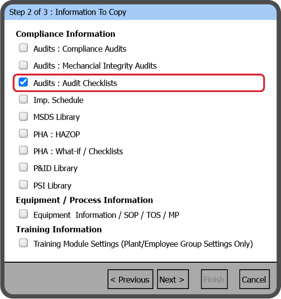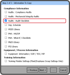 The Audits : Audit Checklists will copy all the Audit Checklists (Legacy) in the Source Plant. You can't select individual Audit Checklists.