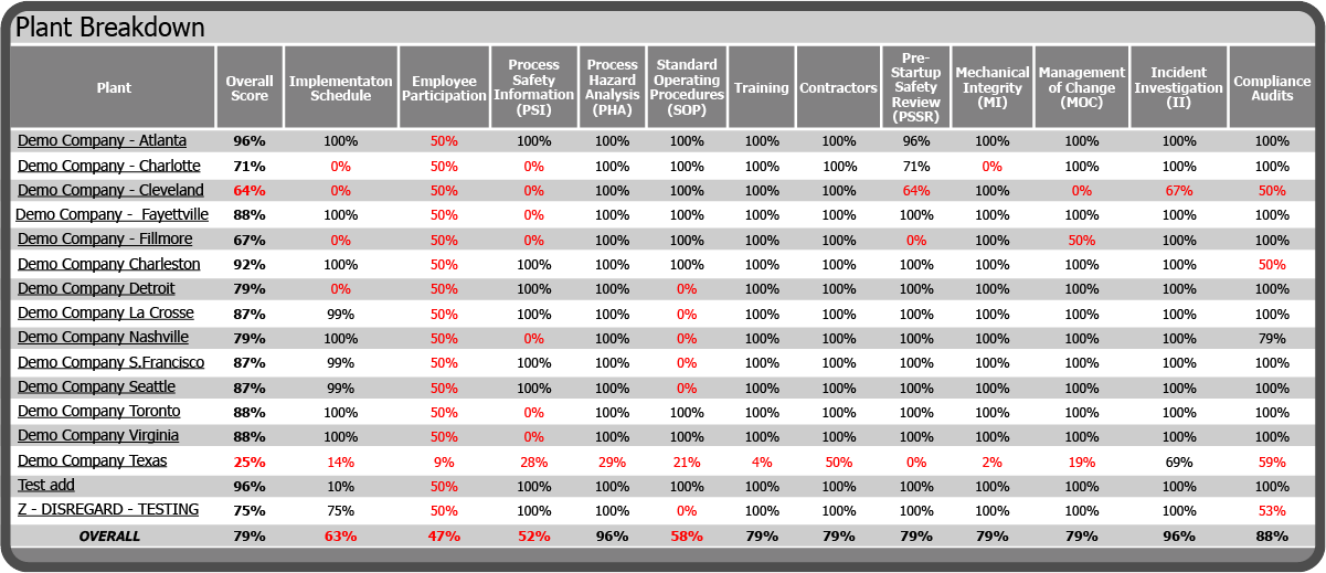 The Region Scorecard displays PSM Element Scores for each Plant in the Region, each Plant's Overall Score, the Region's Overall Score for each PSM Element, and the Region's Overall Score.