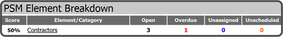 The Contractors Summary gives the Score details along with the number of Open, Overdue, Unassigned, and Unscheduled counts. To access the Summary details select Contractors in the Element/Category column.