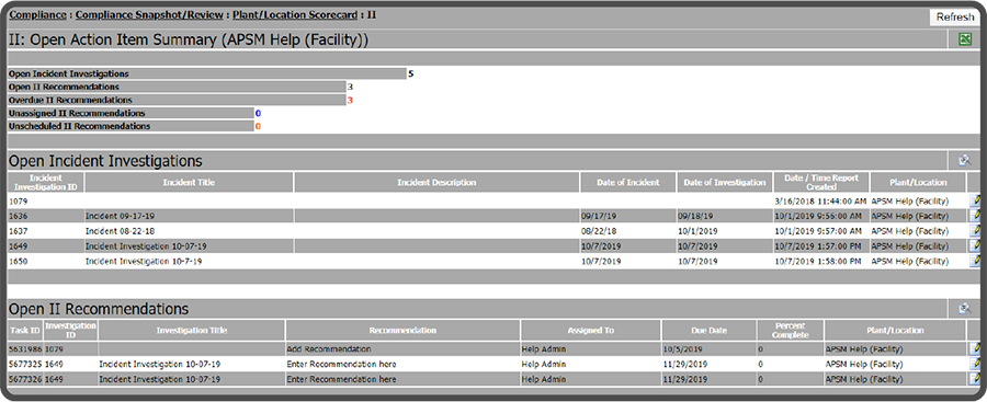 Scorecard - Incident Investigation (II) Open Action Item Summary