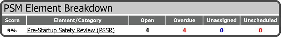 The Pre-Startup Safety Review Summary gives the Score details along with the number of Open, Overdue, Unassigned, and Unscheduled counts. To access the Summary details select Pre-Startup Safety Review (PSSR) in the Element/Category column.
