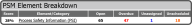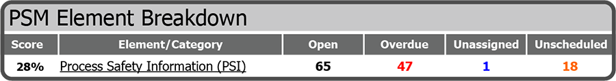 The Process Safety Information Summary lists the details for the Score along with the number of Open, Overdue, Unassigned, and Unscheduled counts. To access the Summary details, select Process Safety Information (PSI) in the Element/Category column.