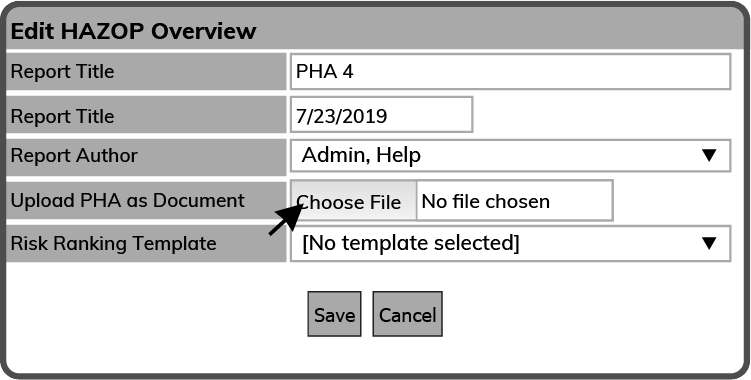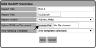 This will open the Edit HAZOP Overview window. Give the PHA a Report Title, a Report Date, and choose a Report Author. To upload a PHA, select the Choose File Button