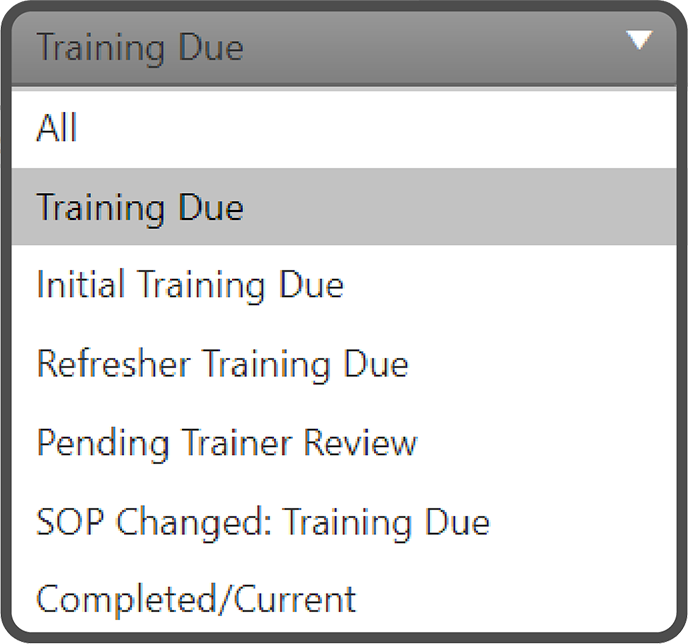 | Training Due | Lists only the SOP Training that is currently Due |
