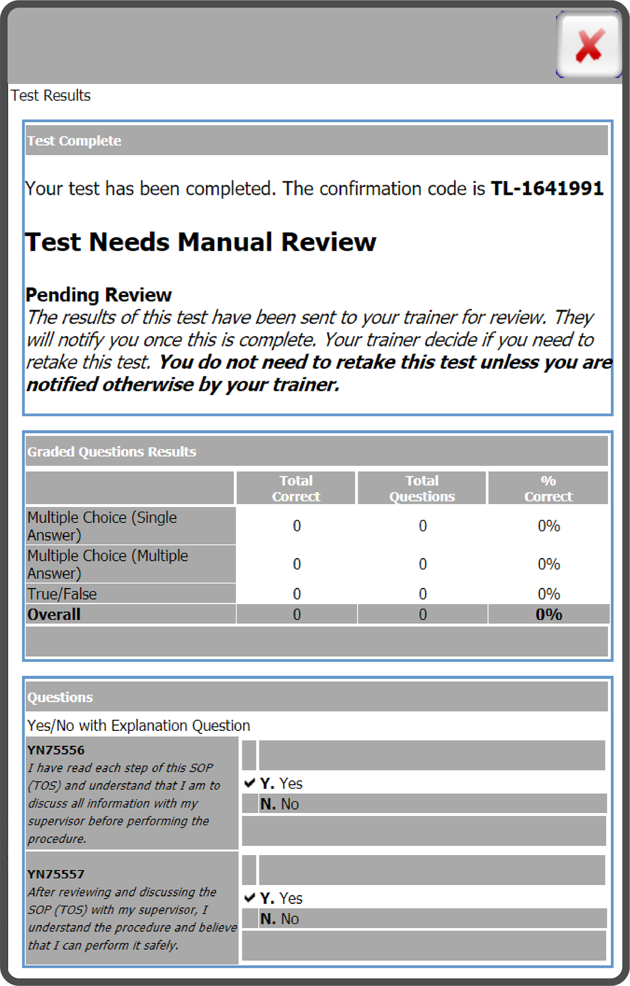 , you will see your Test Results. The Results may include Graded Question Results and/or Questions. You will also receive a Confirmation Code for completing the Test. Once you have reviewed the Results select the Red X Button