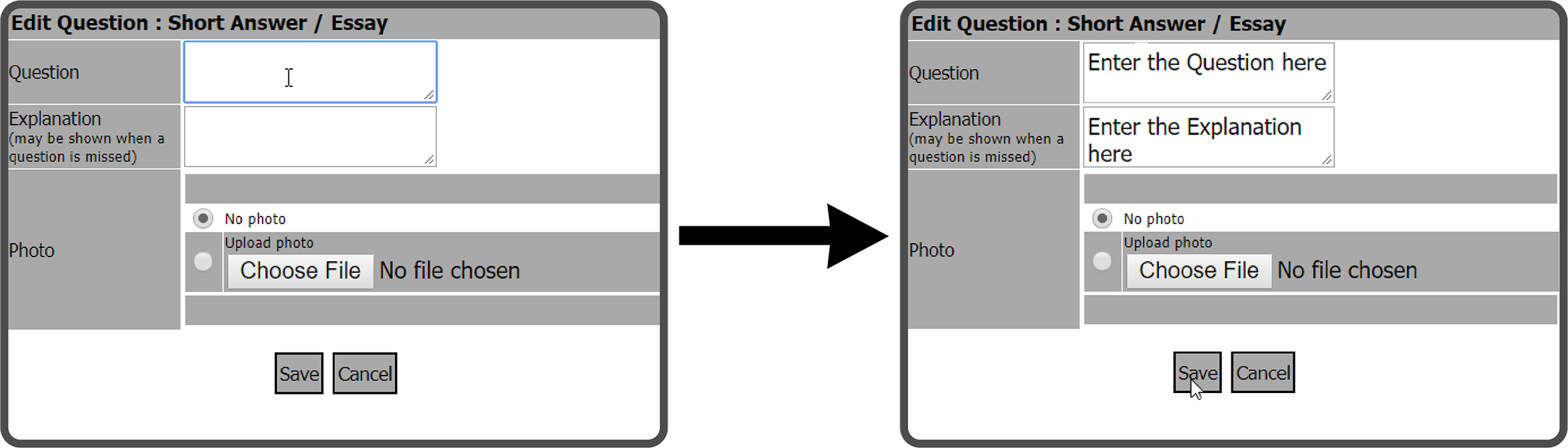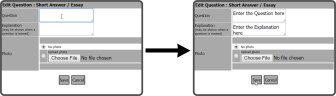 This will open the Edit Question: Short Answer / Essay window. Enter the Question, an Explanation (optional), upload a photo (optional), and select the Save Button