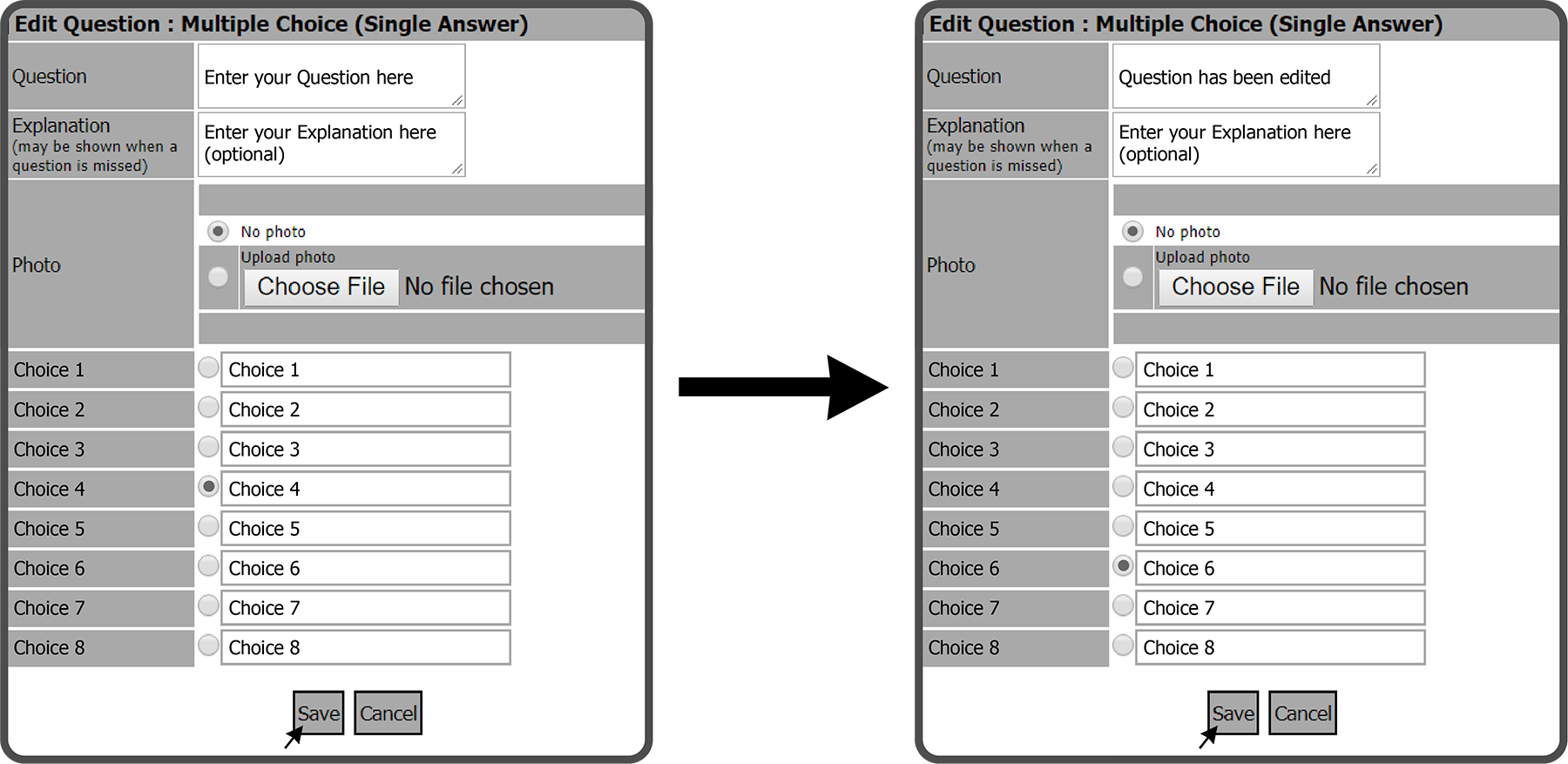This will open the Edit Question: Multiple Choice (Single Answer) window. Make the needed edits and select the Save Button
