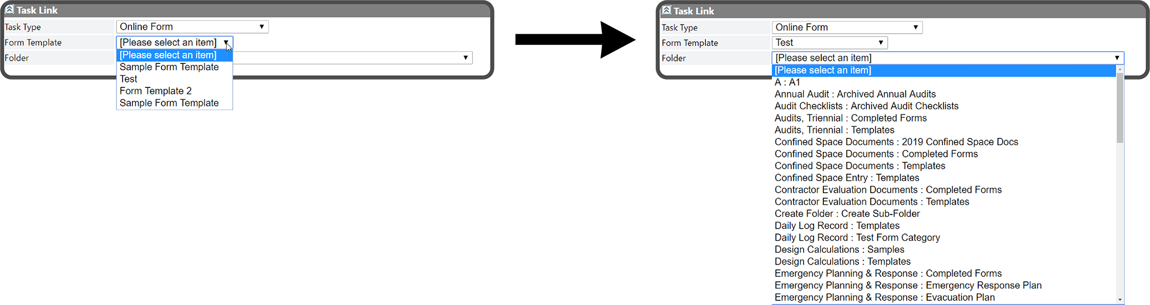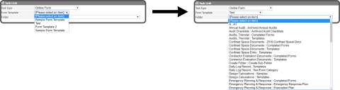 The Task Type Online Form is used to schedule and assign the Task of a Recurring online form or permit. After selecting Online Form, select the Form Template to use and the Folder/Subfolder combination to save the form to when the Task is completed.