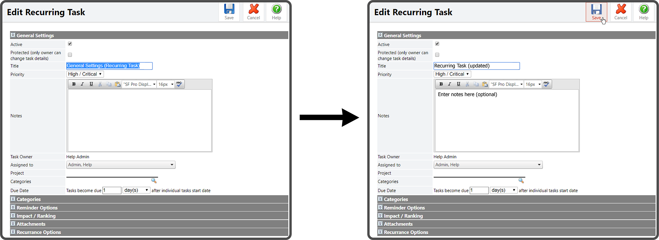This will open the Edit Recurring Task page. Make the needed changes to the General Settings, Reminder Options, Impact / Ranking, Recurrence Options, and select the Save Icon