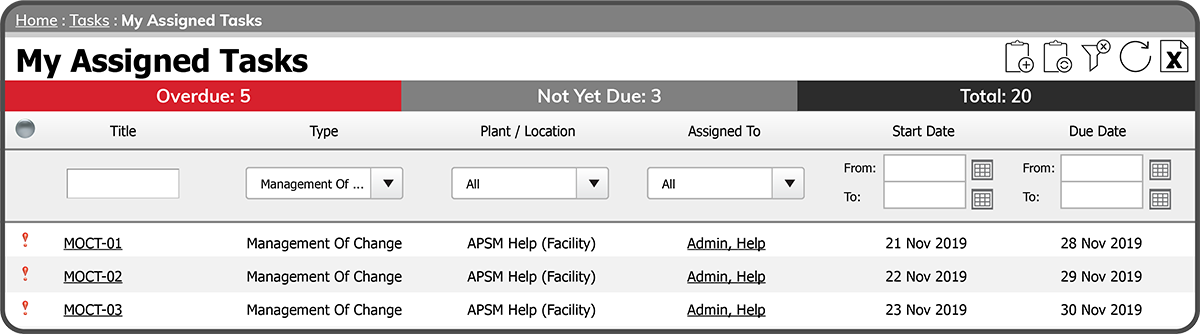 The Management of Change (MOC) Task Type is a Task assigned to you (or your MOC Group) from an MOC step.