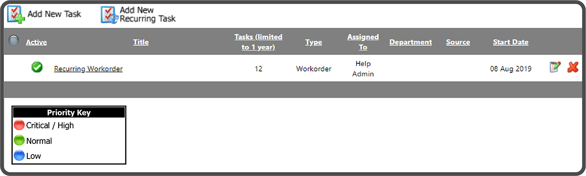 The Recurring Task Section displays the Recurring Task Templates. You can modify and delete Recurring Tasks from the Recurring Tasks Grid.