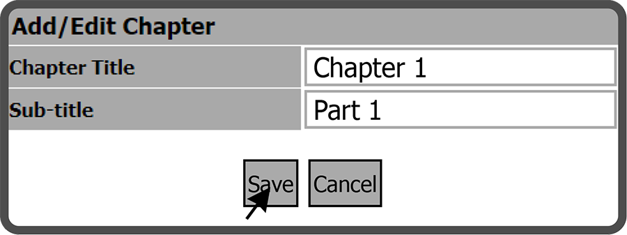 This will open the Add / Edit Chapter window. Enter a Chapter Title, a Sub-title (optional), and select the Save Button