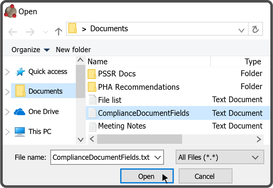 Locate and select the ComplianceDocumentFields.txt file you downloaded and then select the Open Button