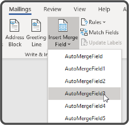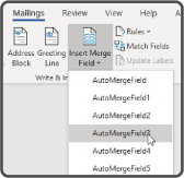 Select Insert Merge Field from the ribbon and then select the specific Merge Field you want to use.