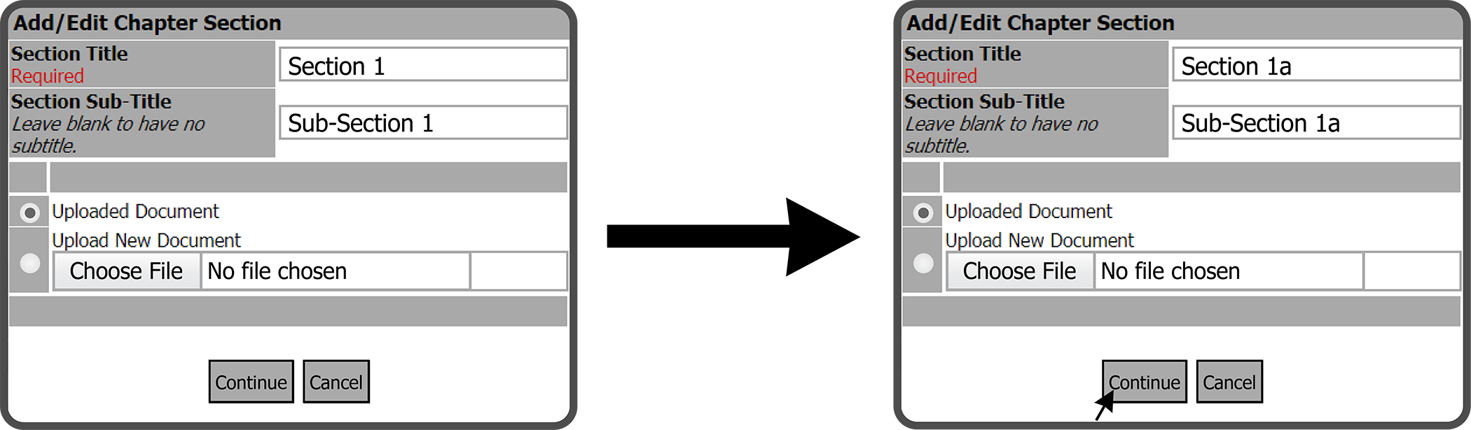This will open the Add / Edit Chapter Section window. Make the needed changes and select the Continue Button